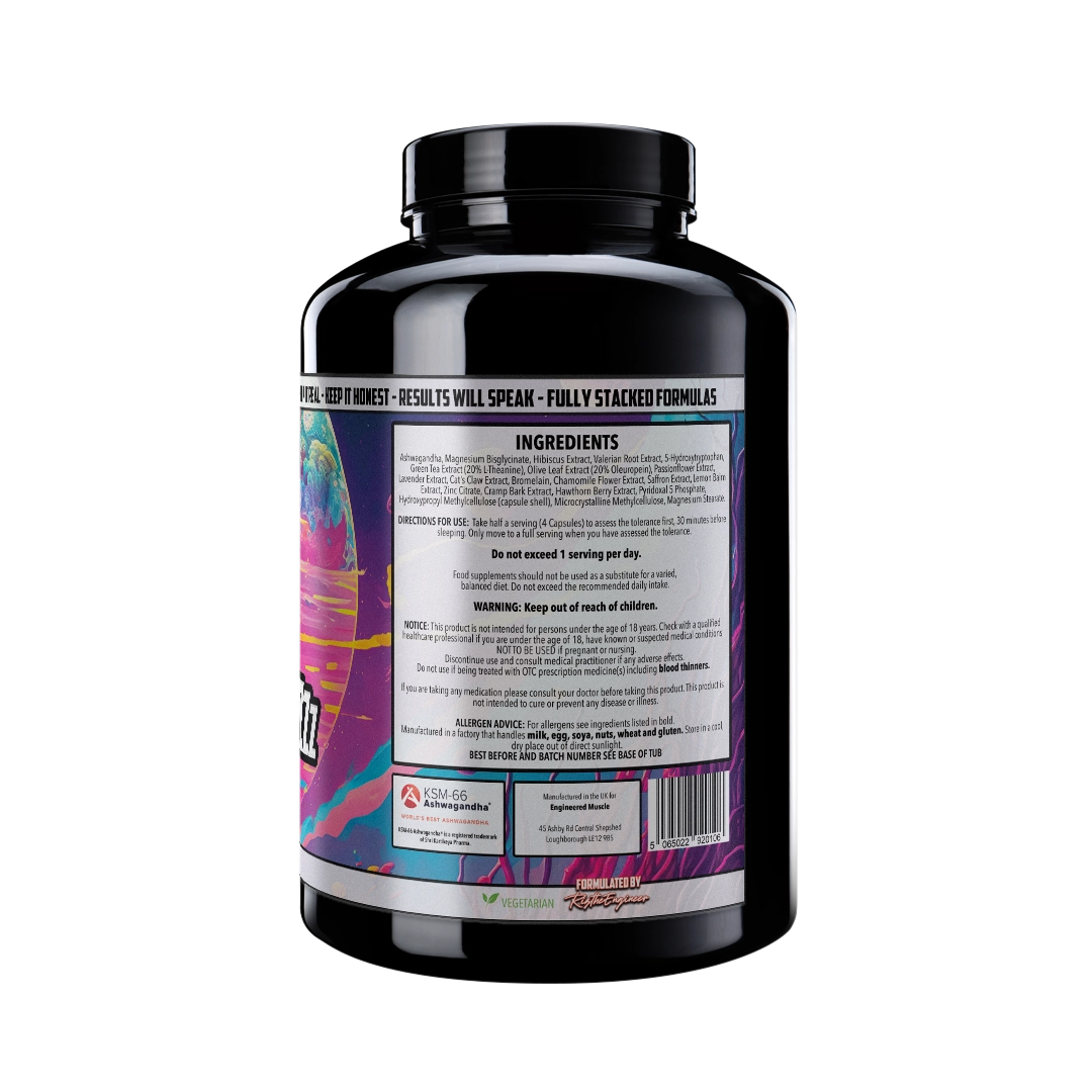 The patented KSM-66® Ashwagandha, renowned for its adaptogenic benefits, works synergistically with other key ingredients such as 5-HTP, Zinc Citrate, and Saffron Extract to enhance mood and overall relaxation.